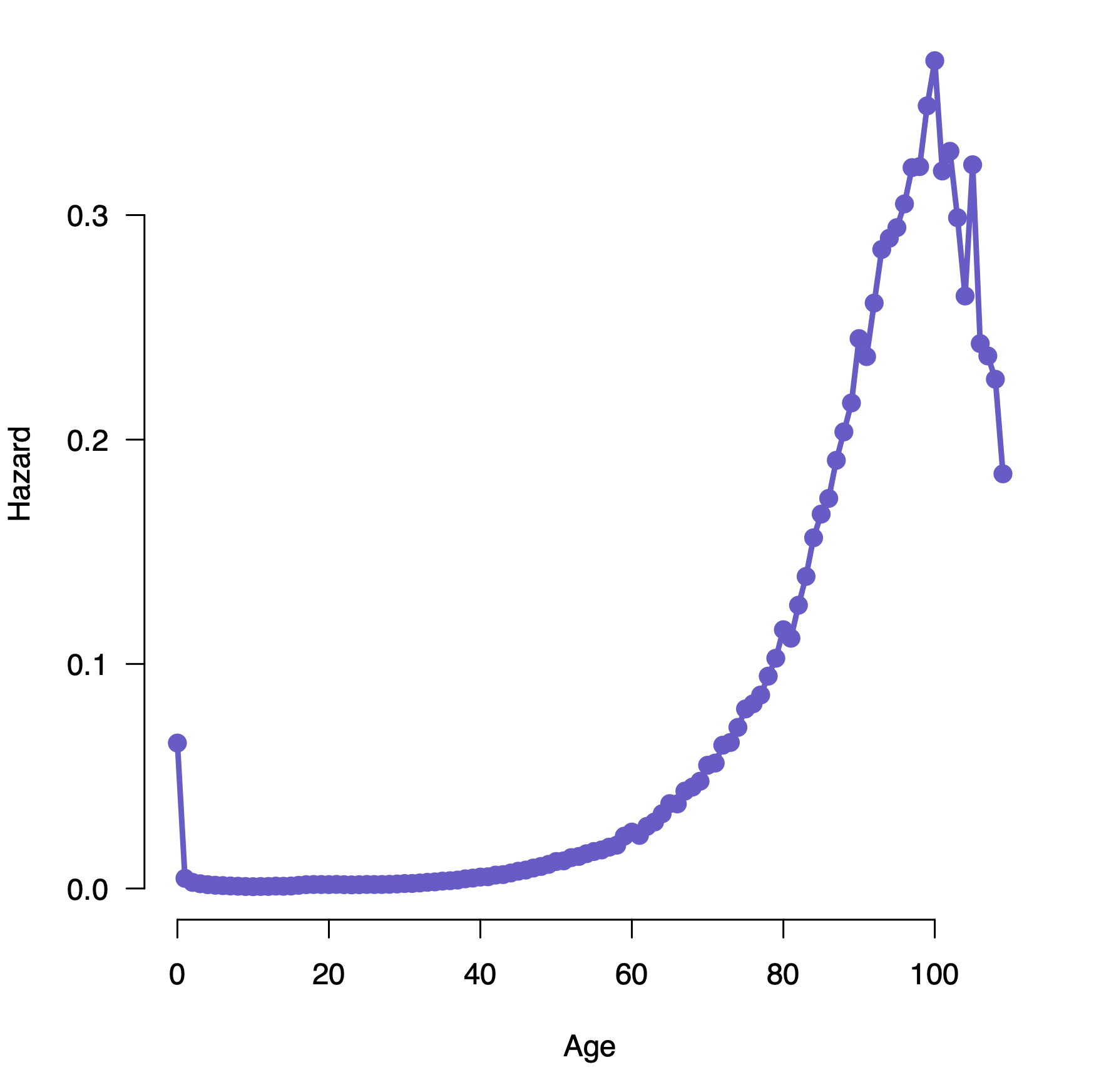 Let’s think about how the hazard function for different processes might look. Think of typical human populations. There is an increased chance of dying very early in life (the first year), which reduces over time to some steady value through the teen and adult years, then increases again late in life. This might look like this: